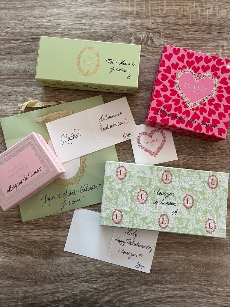 Pour cet évènement Saint Valentin, Ladurée à pu offrir à ses clients la possibilité de personnaliser leurs achats ou d’ajouter une carte calligraphiée pour leurs proches.